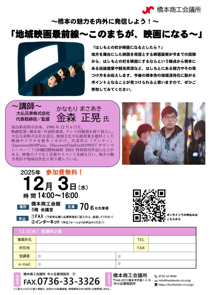 地方を舞台にした映画を得意とする映画監督金森正晃氏が今までの経験から、はしもとの町を映画にするならという観点から橋本にある伝統産業や観光資源など、はしもとにある魅力やその見つけ方をお伝えしてくれます。今後の橋本市の地域活性化に繋がるポイントとなることが見つけられると思います。